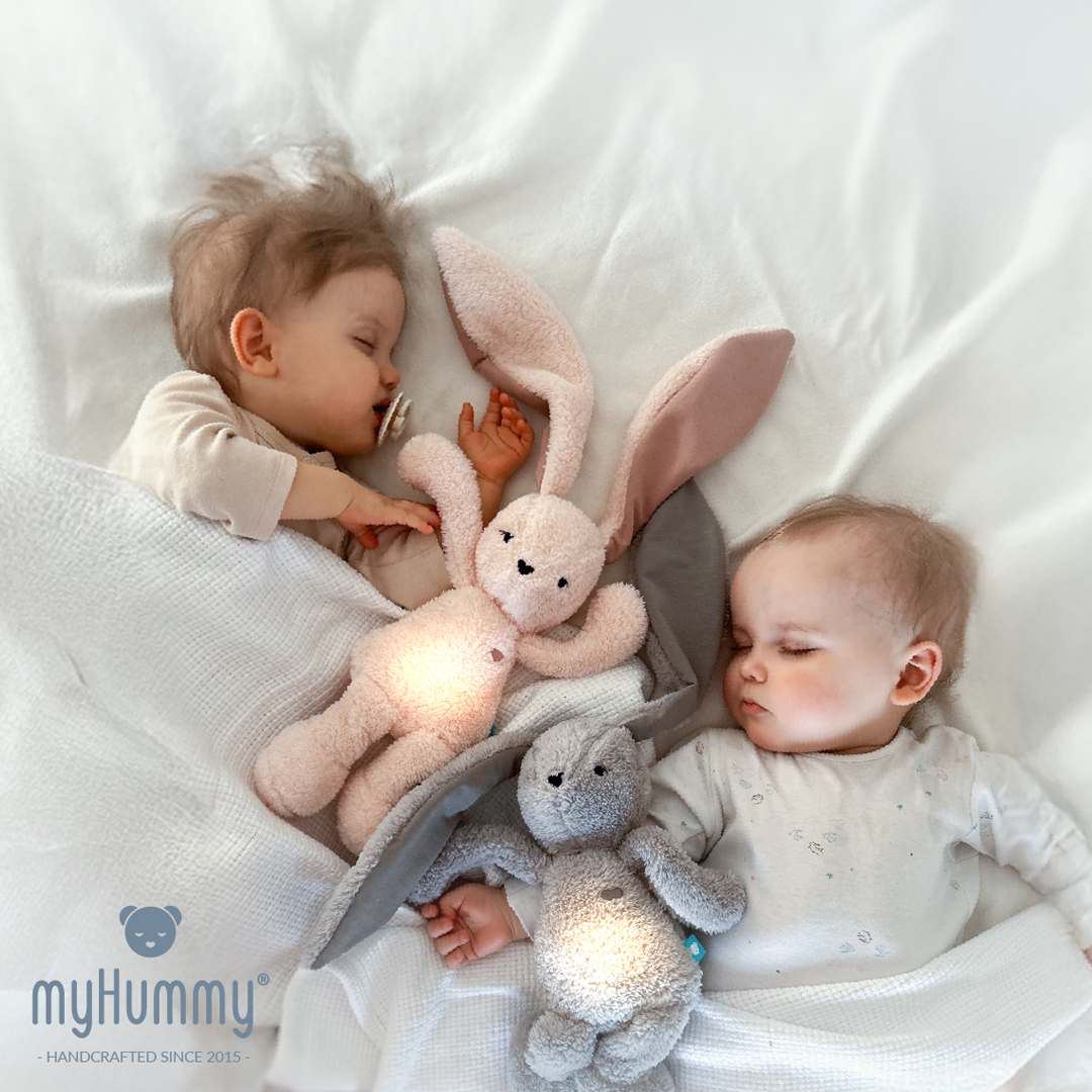 The MyHummy bunny cuddling toy is a cute and functional bedtime companion that helps your baby fall asleep more easily. It plays soothing sounds (white, brown, and pink noise), gentle lullabies, and vibrates like a heartbeat, while softly glowing in warm white or red light.