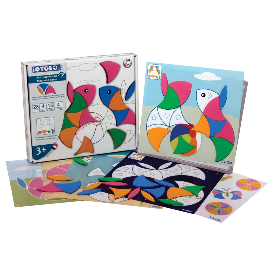 Rinkinyje – 28 minkšti magnetukai skirtingų formų ir spalvų, magnetinė lenta, paveikslėliai-pavyzdžiai ir spalvų kodai, padedantys lengvai kurti net patiems mažiausiems. Iotobo dėlionės turi net 4 žaidimo būdus – nuo dėliojimo pagal kodus iki visiškai laisvos fantazijos.