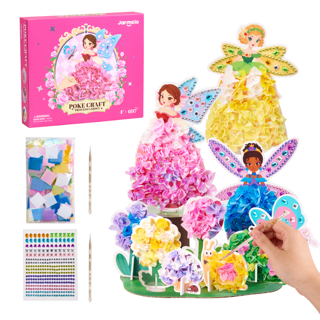 Rinkinyje vaikai išbandys tris kūrybines veiklas. Pirmiausia kuriama įspaudžiant spalvotas audinio detales į specialią putplasčio plokštę naudojant tam skirtą įrankį. Vėliau pagal pažymėtas vietas klijuojamos blizgios juostelės su dekoratyviniais akmenėliais, kurios suteikia kūriniui žvilgesio ir išraiškingumo. Galiausiai, vadovaujantis instrukcija, visos detalės sujungiamos į vieną visumą – lipniais taškeliais tvirtinami drugeliai, gėlės, žolė, kelmeliai ir sraigė, o princesės pastatomos ant pagrindų. Taip prieš vaiko akis atgyja stebuklingas trimatis princesių sodas!