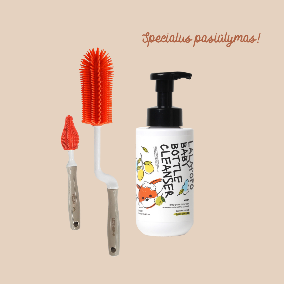 Specialus pasiūlymas! Mother-K silikoniniai buteliukų ir gertuvių plovimo šepetėliai + K-MOM Lalapopo maitinimo buteliukų, vaisių ir daržovių ploviklis (putų konsistencijos)