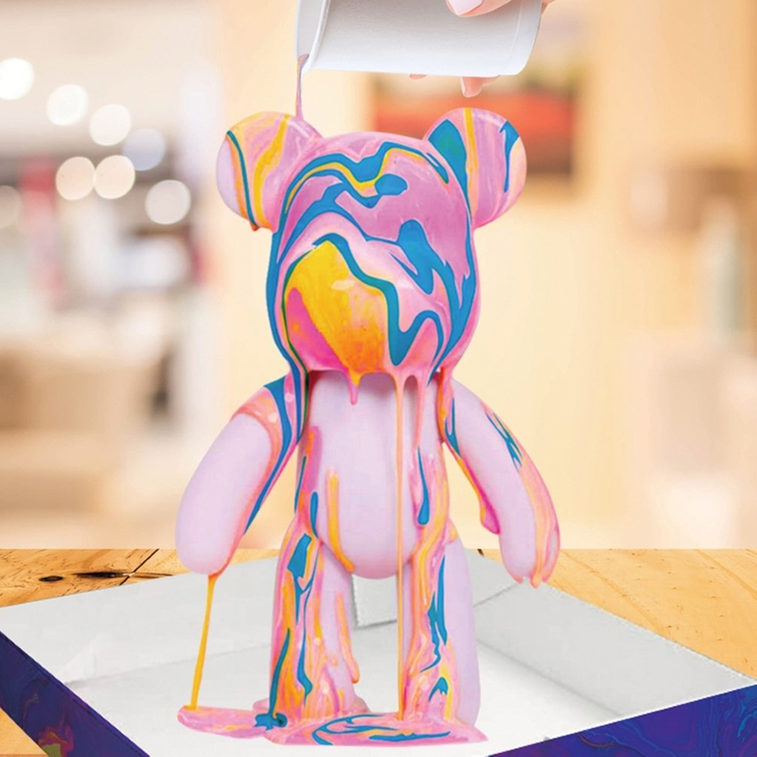 Tegul dažai liejasi – pilk juos ant viršaus. Ištepk viską margais sūkūriais! Naudok šepetėlį ir šaukštelį sunkiai pasiekiamoms vietoms.